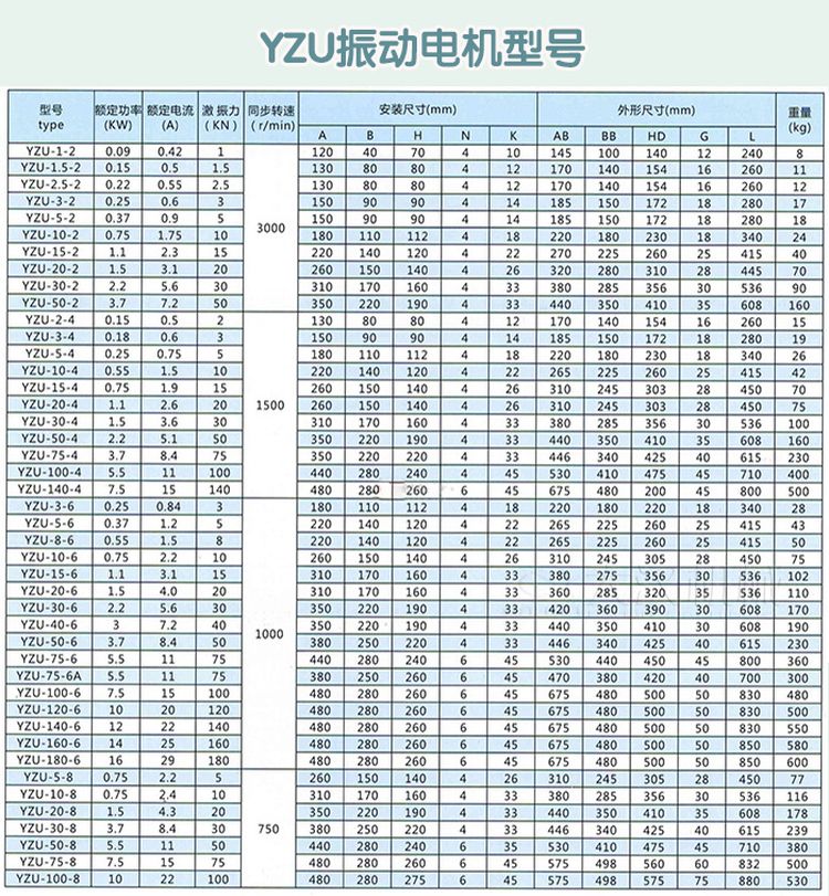由上表我們可以清晰地看到,YZUL振動電機(jī)有不同的規(guī)格型號,功率越大,價格就會越高。