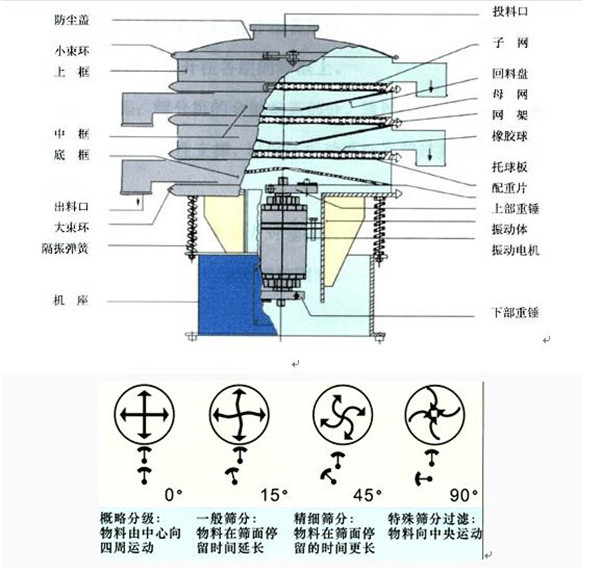 旋振篩是由直立式電機(jī)作激振源,電機(jī)上、下兩端安裝有偏心重錘,將電機(jī)的旋轉(zhuǎn)運(yùn)動(dòng)轉(zhuǎn)變?yōu)樗?、垂直、傾斜的三次元運(yùn)動(dòng),再把這個(gè)運(yùn)動(dòng)傳遞給篩面。通過調(diào)節(jié)上、下兩端的相位角,可以改變物料在篩面上的運(yùn)動(dòng)軌跡,通過增減振動(dòng)電機(jī)上下兩端的偏心重錘配重塊重量可以增加和減少震動(dòng)幅度。