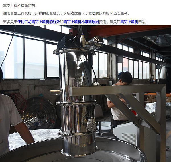 真空上料機(jī)在輸送不同物料的時(shí)候,運(yùn)輸速度和運(yùn)輸效果是不同的。如果物料的質(zhì)量越大,運(yùn)輸時(shí)間就越長(zhǎng),運(yùn)輸效果就越糟糕;如果物料比較潮濕,可能不太適合用真空上料機(jī)進(jìn)行輸送,因?yàn)檫@樣會(huì)導(dǎo)致運(yùn)輸速度減慢,甚至?xí)袣堄辔锪险丛谠O(shè)備上。