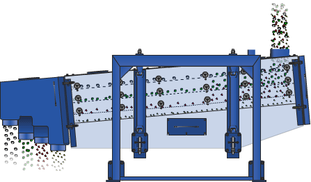 設(shè)備的篩箱在慣性力的作用下作前后往復運動,并帶動篩面做周期性搖動,迫使篩面上的物料隨篩箱一同做定向跳躍式運動,小于篩面孔徑的物料通過篩框落到下層,稱為篩下物,大于篩面孔徑的物料經(jīng)連續(xù)翻滾跳躍運動后從排料口排出,完成篩分作業(yè)。