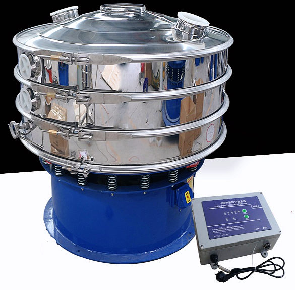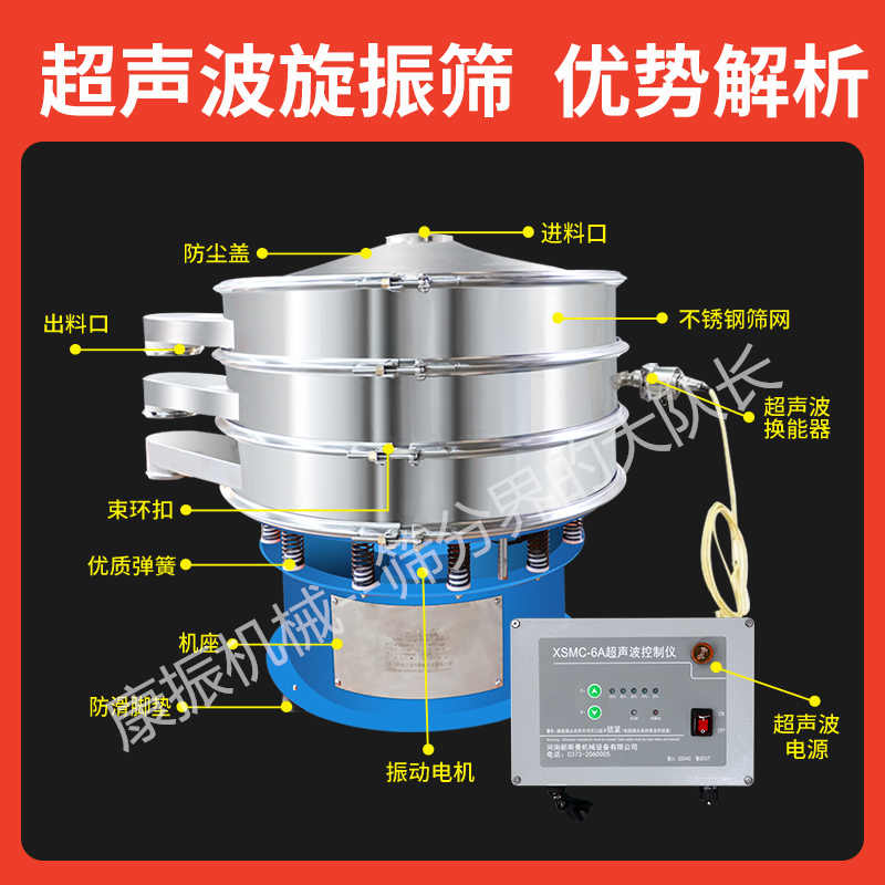 超聲波振動篩是將220V、50Hz或110V、60Hz電能轉(zhuǎn)化為36KHz的高頻電能,輸入超聲換能器,將其變成36KHz機(jī)械振動,產(chǎn)生的功率超聲波使篩網(wǎng)作高頻振動。篩網(wǎng)上的物料在作低頻旋振運(yùn)動的同時,疊加上超聲振動,既可防止網(wǎng)孔堵塞,又可使篩分機(jī)提高產(chǎn)量和質(zhì)量,從而達(dá)到快速篩分和清網(wǎng)的目的,使超微細(xì)粉篩分成為易事。該系統(tǒng)在傳統(tǒng)的振動篩基礎(chǔ)上在篩網(wǎng)上引入一個低振幅、高頻率的超聲振動波(機(jī)械波),以改變超微細(xì)分體的篩分性能。特別適合高附加值精細(xì)分體的用戶使用。